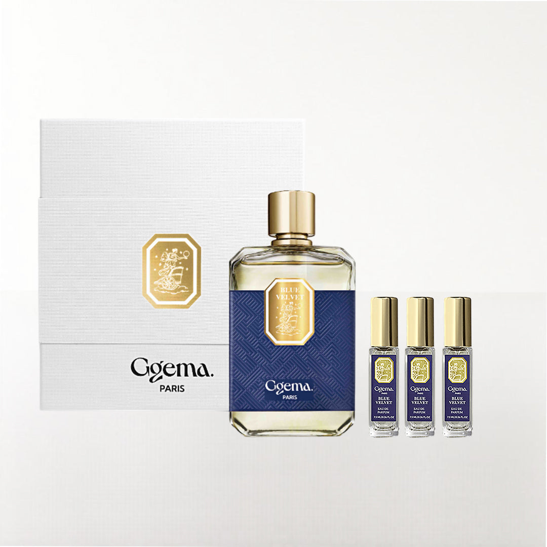 An exclusive gift set featuring one full Blue Velvet bottle(100ml) and one travel sprays of Duke, Crown and Royal Sapphire (7,5ml each).